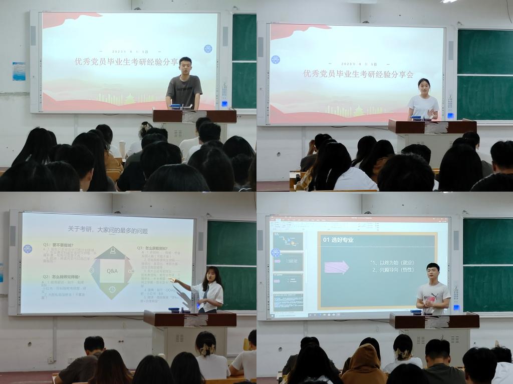 随后,4名优秀毕业生党员逐一进行考研经验分享。他们分别从专业选择、院校选择、专业课学习方法、备考时间分配、心态调整等方面作出了详细讲解;强调制定个人学习规划要注重阶段性与总体性的统一,结合自身情况,切勿好高骛远;指出考研贵在坚持,唯有矢志不渝的奋斗才能使“上岸”成为可能。