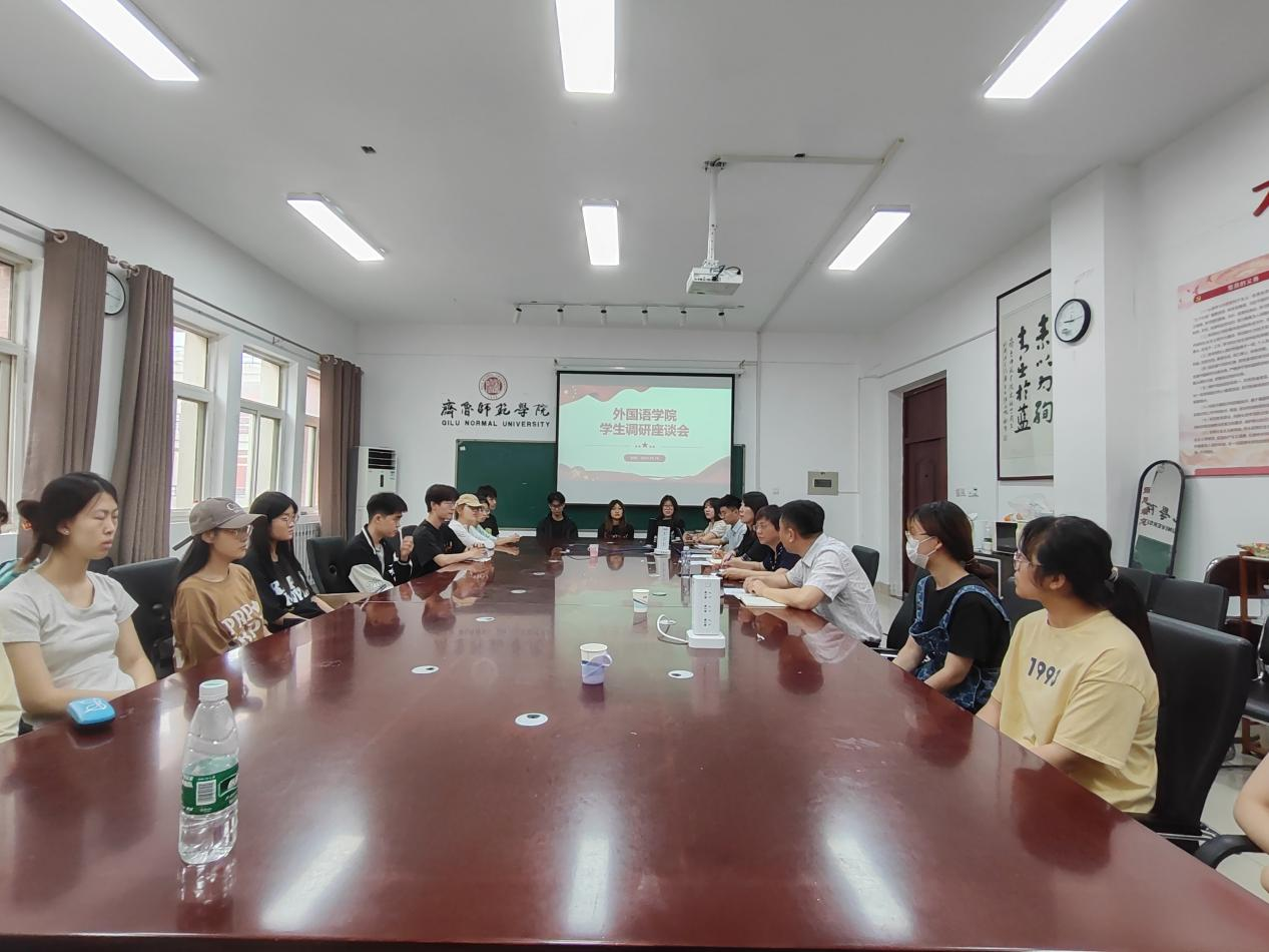 在学校深入开展学习贯彻习近平新时代中国特色社会主义思想主题教育之际,为进一步推动调查研究走深走实,更好地为学生办实事、解决学生在校期间的急愁难盼问题,全面听取学生对学院教育教学、管理服务等多方面的意见建议,6月19日上午,外国语学院在学院会议室召开主题教育学生座谈会。学院党委书记于江、院长宋秀葵、党委副书记迟英娟,学院团总支成员以及各年级各专业学生代表参加座谈。