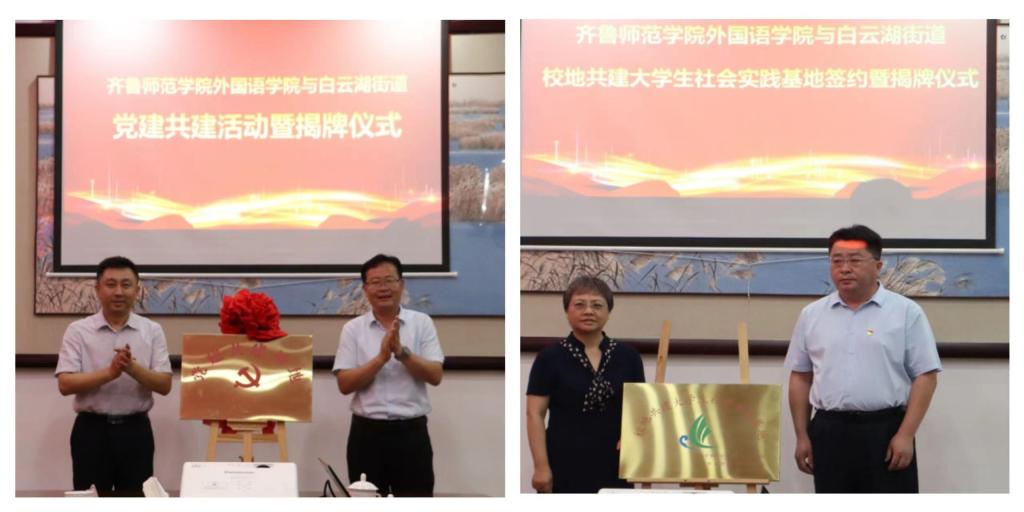 为推动学习贯彻习近平新时代中国特色社会主义思想主题教育走深走实,进一步强化党建引领,推进校地融合、双向共建,搭建大学生社会实践平台,7月13日上午,外国语学院与章丘区白云湖街道举行“党建共建暨大学生社会实践基地”签约揭牌仪式。外国语学院党委书记于江、院长宋秀葵,白云湖街道党工委书记袁致甲、办事处主任程涛远出席仪式。