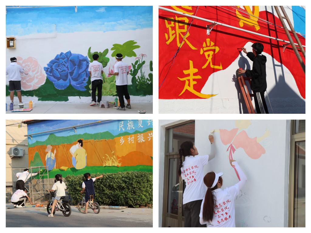 近期,齐鲁师范学院美术学院以“暖心助绘”为主题,组织“薪火相传 永跟党走”“传红色声音,树时代榜样”两支大学生暑期社会实践队分别来到到商河县孙集镇、邹平市好生初级中学开展了社会实践活动。队员们在墙绘中将专业知识和本领转化为志愿活动的实际行动,诠释着当代青年的责任与担当。