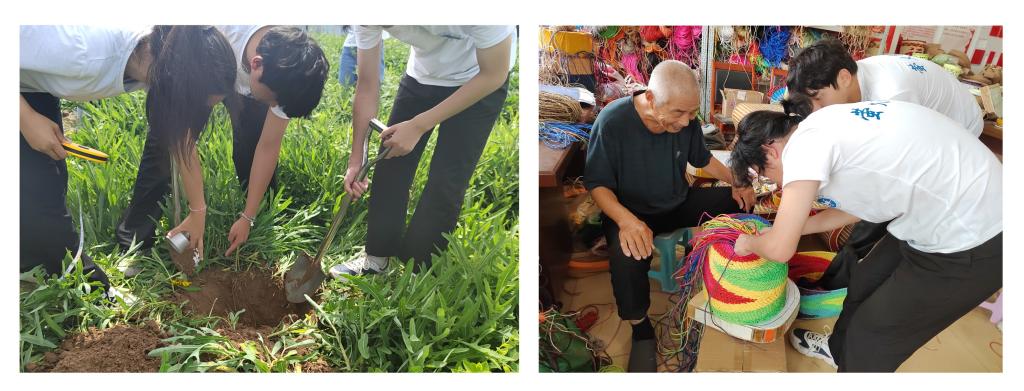 发挥优势,助力乡村特色产业发展。队员们前往一线市场调研黄河编织文创销售情况,深入垦利区东宋村编织作坊了解黄河编织文创生产情况并与东宋村达成初步合作意向,后续将为编织文创的设计与开发提供思路与创意,助力产品开发与销售;深入杨庙社区农业生产合作社调研当地特色农产品生产及销售情况,并在不同地块采集土壤样本和水源样本带回分析,后续将形成完整分析报告和作物种植建议,帮助合作社进一步提高作物产量。队员们还录制了合作社农产品宣传视频,后期将通过视频投放和抖音直播的形式帮助合作社进一步打开销售渠道,促进农民扩产增收。